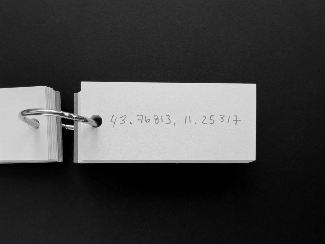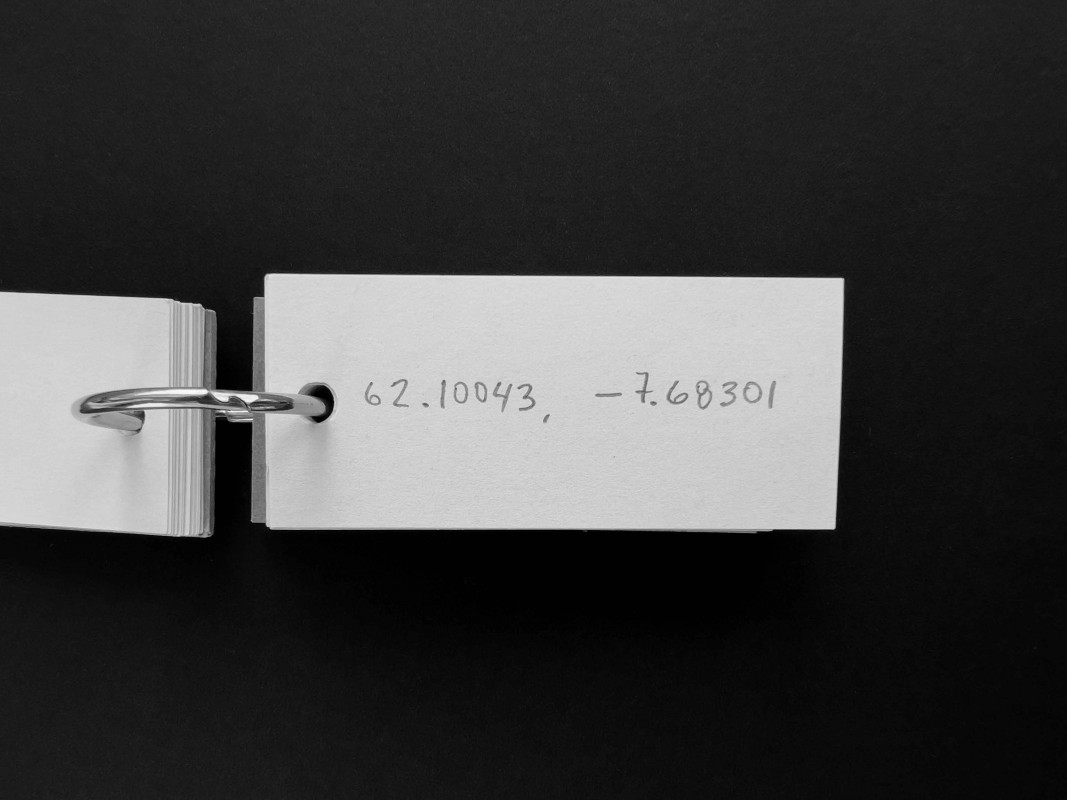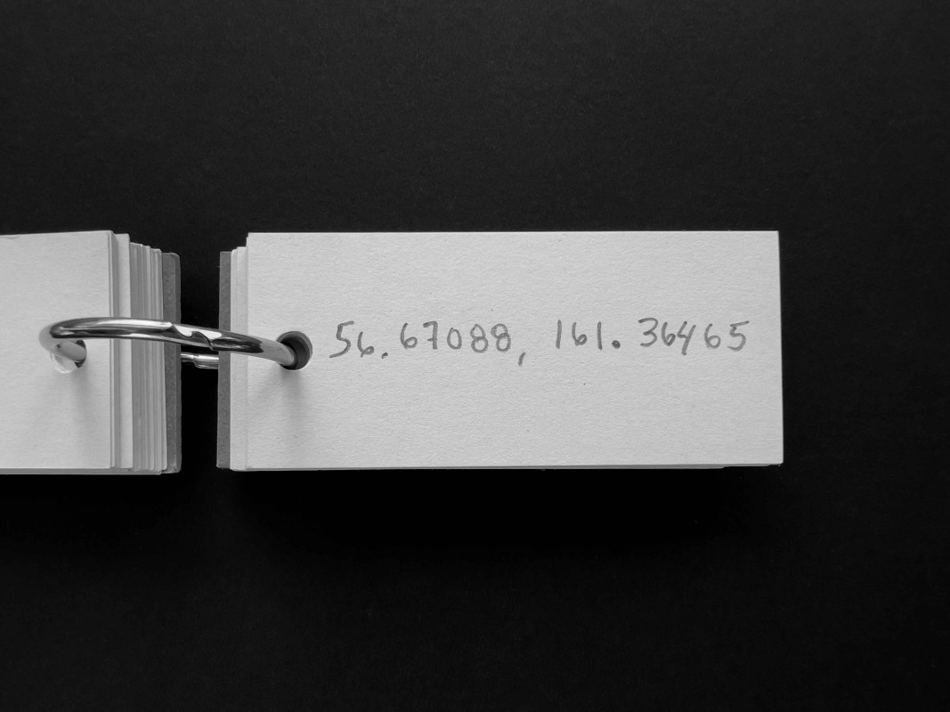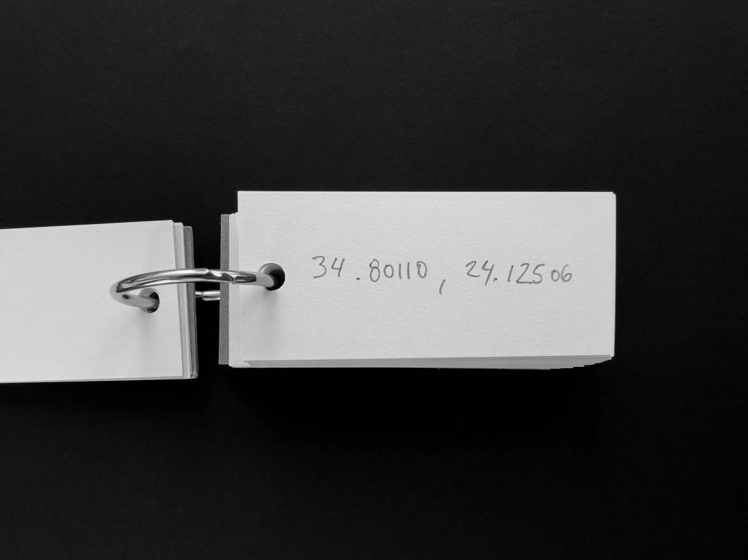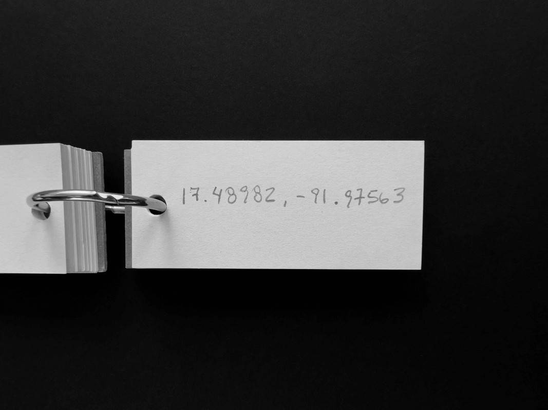 It could be a machine for charting imagined routes, a compendium of places visited or never reached, a logbook of potential journeys. The notebook -its pages filled with coordinates written in pencil, in decimal degrees- fits in the palm of a hand. The object unfolds each time someone searches for one of its coordinates on a map, where the figure finds its name and the name finds a site. The first point, just past the cardboard cover, lies on the outskirts of Nicosia, within the self-declared Turkish Republic of Northern Cyprus. Elsewhere one arrives at the Lacandon Jungle in Chiapas, in southeastern Mexico; later, at the Stadlandet peninsula, on the Norwegian Sea; and at the permafrost of New Siberia Island, in the Russian High Arctic. These are four of the fifty-six destinations that the gift holds.