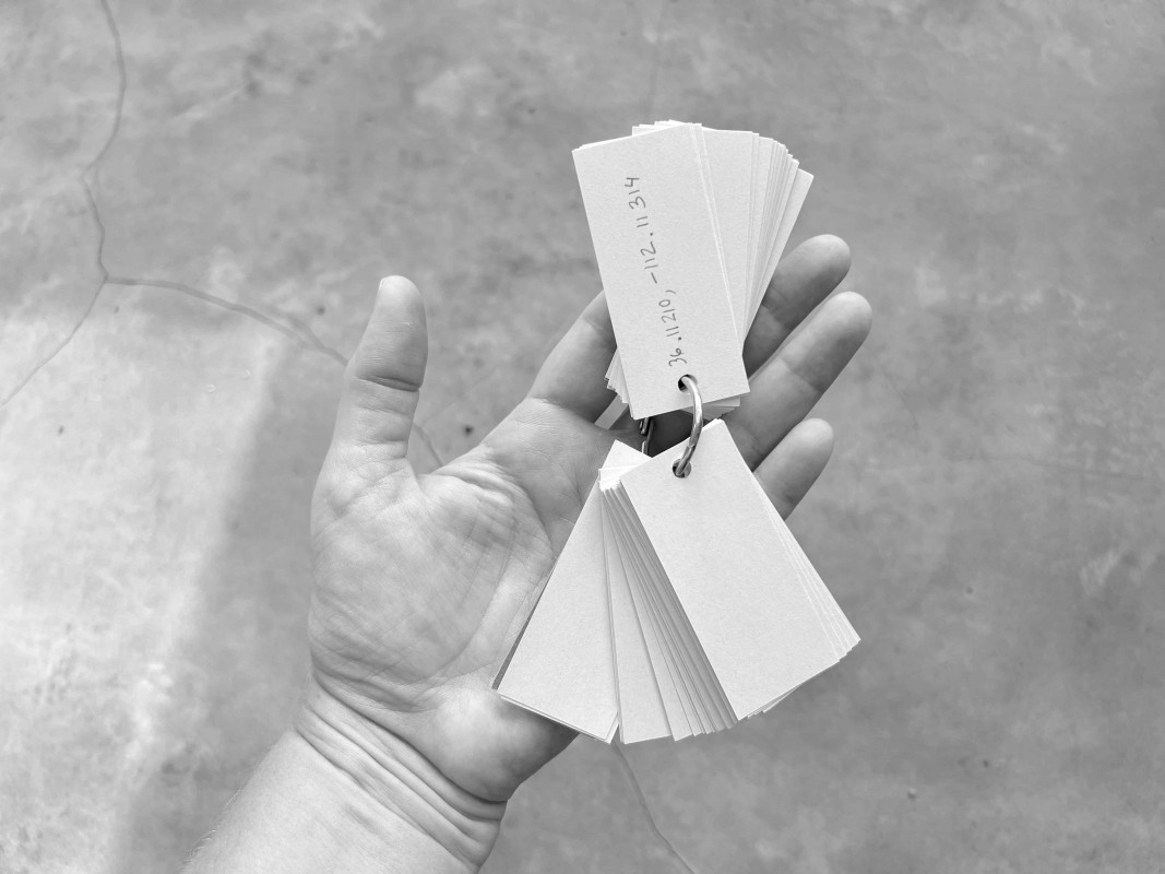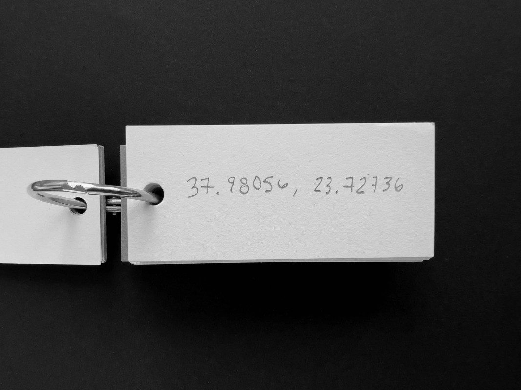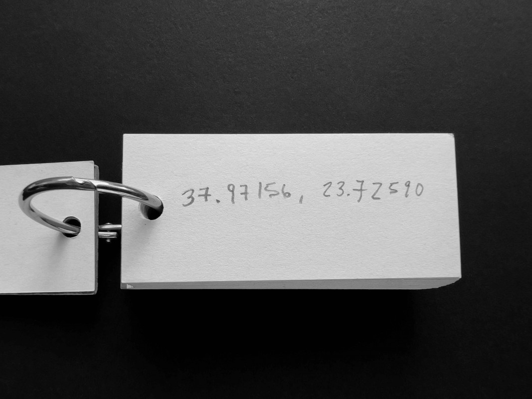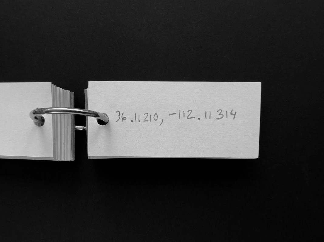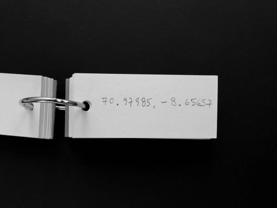 It could be a machine for charting imagined routes, a compendium of places visited or never reached, a logbook of potential journeys. The notebook -its pages filled with coordinates written in pencil, in decimal degrees- fits in the palm of a hand. The object unfolds each time someone searches for one of its coordinates on a map, where the figure finds its name and the name finds a site. The first point, just past the cardboard cover, lies on the outskirts of Nicosia, within the self-declared Turkish Republic of Northern Cyprus. Elsewhere one arrives at the Lacandon Jungle in Chiapas, in southeastern Mexico; later, at the Stadlandet peninsula, on the Norwegian Sea; and at the permafrost of New Siberia Island, in the Russian High Arctic. These are four of the fifty-six destinations that the gift holds.